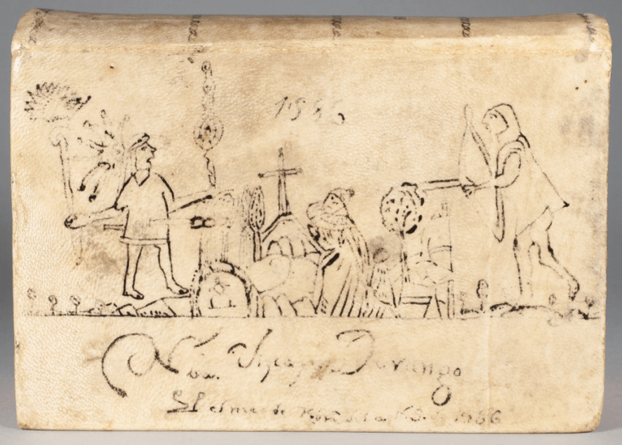 There is very little paratextual information to guide our understanding of the two ink drawings. The ink drawing on the back cover of the binding features a man who wears a shirt, bottoms, and appears to be crucified. The caption on this image is also illegible, only two words can be made out: “Fray” and “Bastian.” Olson offers two possible identifications for the martyred individual, Fray Andrés de la Puebla or Sebastián de Aparicio, the latter who was “a 16th-century Spanish businessman turned ascetic friar who made frequent visits to the Franciscans in Tlalnepantla” (Olson 12). After looking at other visual depictions of Sebastián de Aparicio, I can confirm that he is not the individual depicted in the ink drawing – Sebastián had a tonsure, while the figure in the ink drawing has textured hair and a dark mustache. Furthermore, Sebastián was not martyred, he died of a hernia at the age of 98 in 1600. Although I cannot find many details about Fray Andrés, since he was a Franciscan, he too would have had a tonsure and should also be ruled out. I have no idea who this figure is and cannot offer an alternative identification at this time. Even more interesting, I think, is the ink drawing on the front cover of the binding. This ink drawing provides just enough details to critically fabulate and create meaning out of this scene.